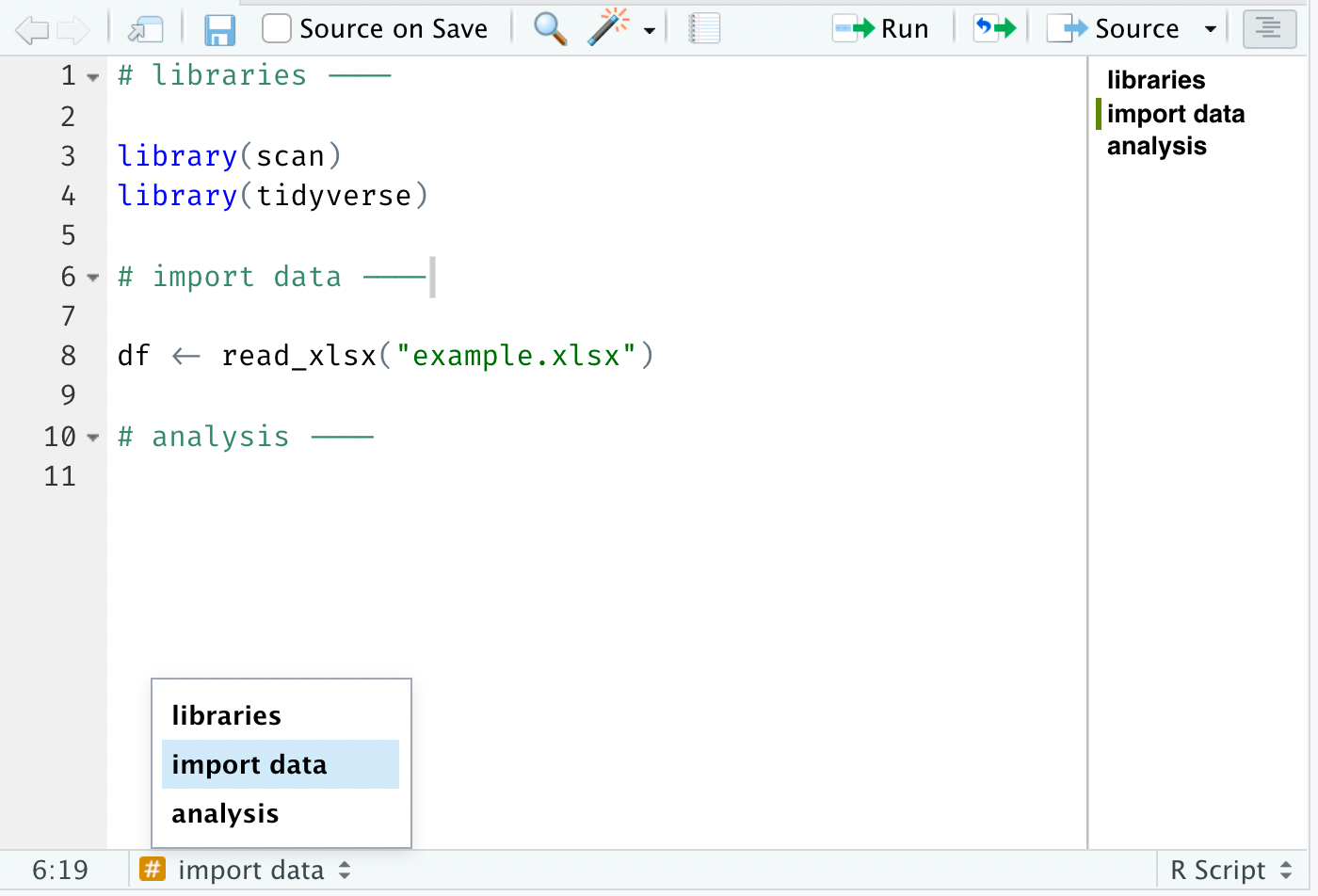 #symbol.Within RStudio, you can use comments to create headers to navigate through your code by ending a comment line with four